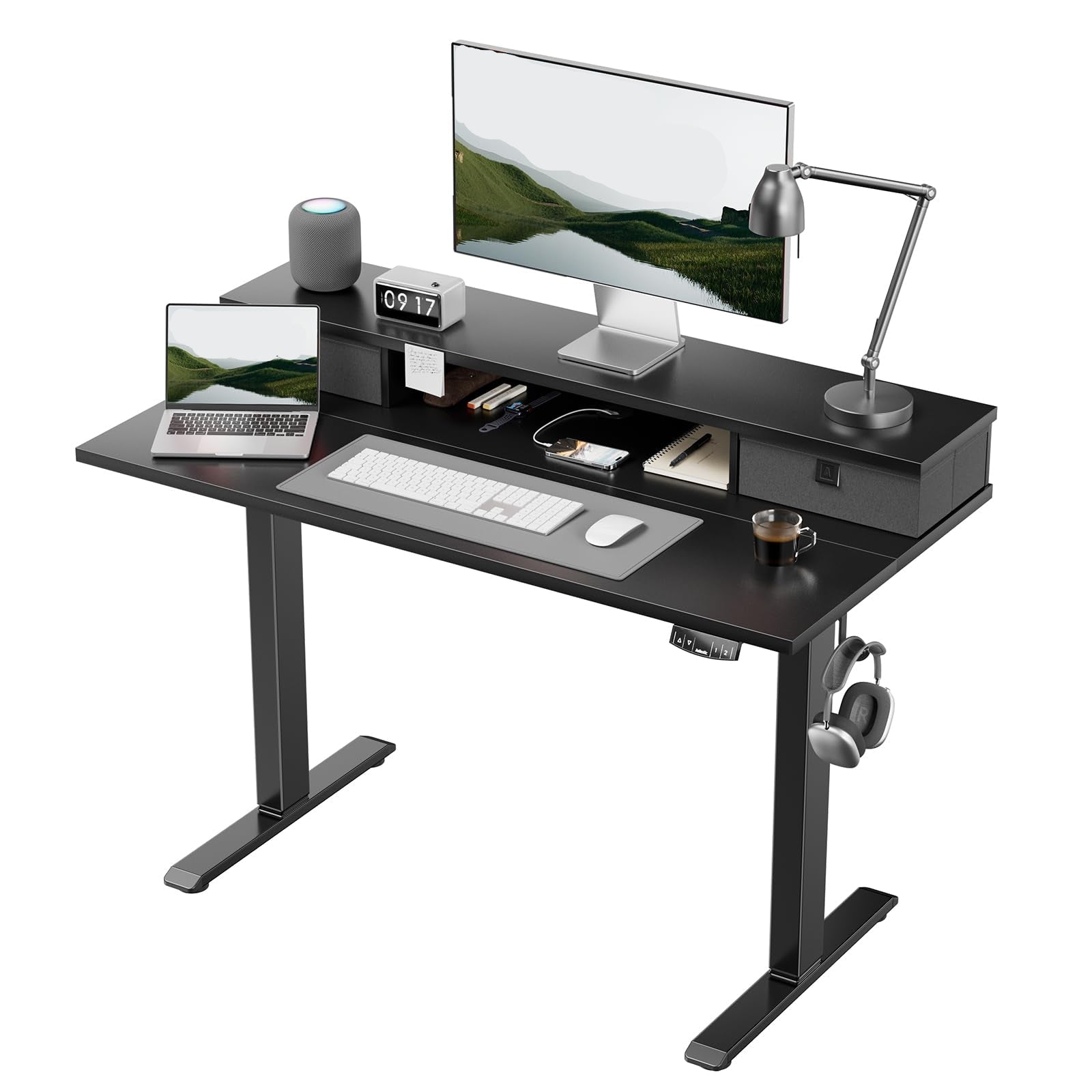 - Tukeva runko ja kestävä moottori: Teollisuusluokan teräsrunko ja T-muotoinen runkorakenne varmistavat, että tämä seisomapöytä tukee enintään 70 kg:n painoa.