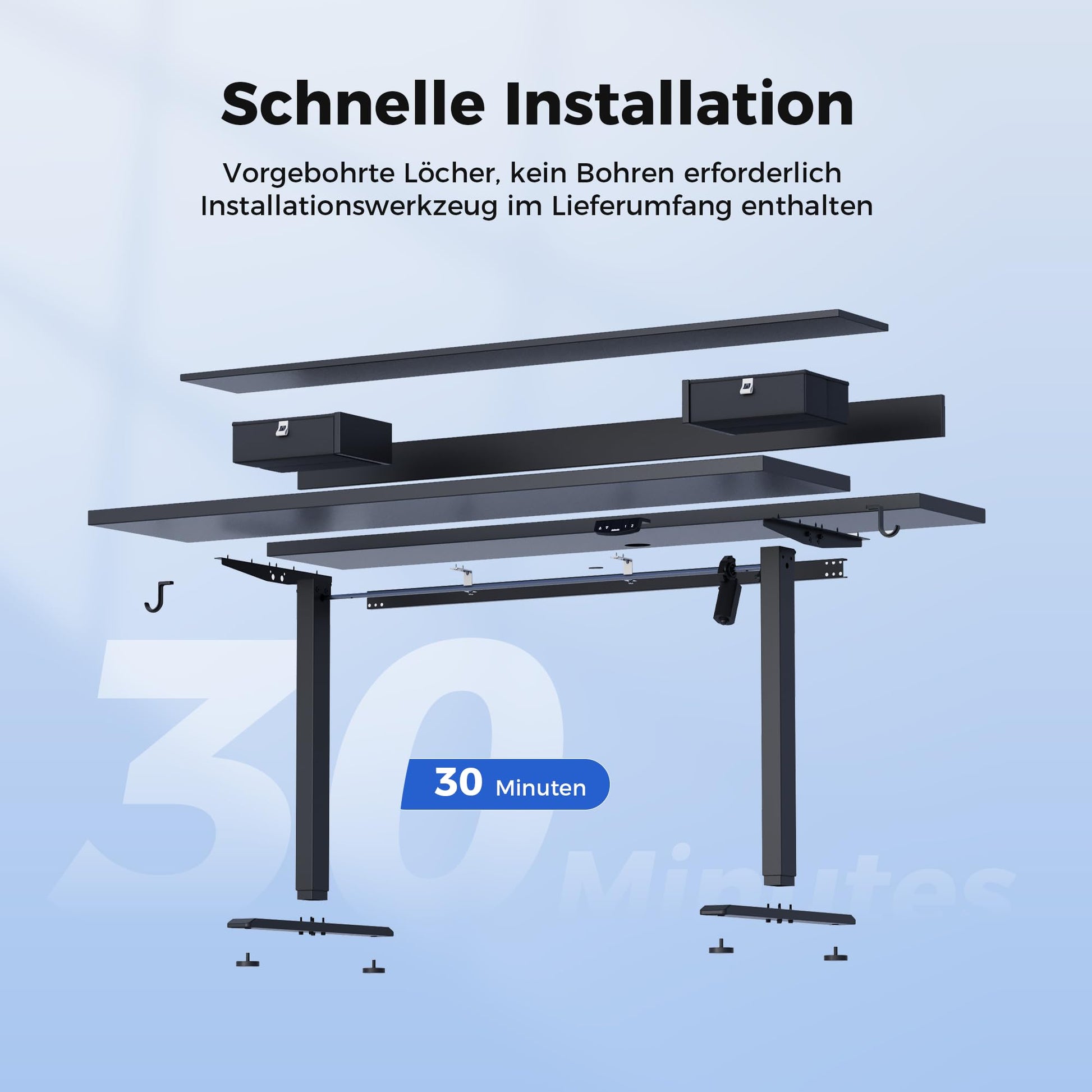 - Helppo koota: sähkökäyttöisen seisomapöytämme asennusprosessi on erittäin yksinkertainen ja kestää vain muutaman vaiheen. Pakkaus sisältää asennusohjeet ja kokoamistyökalut