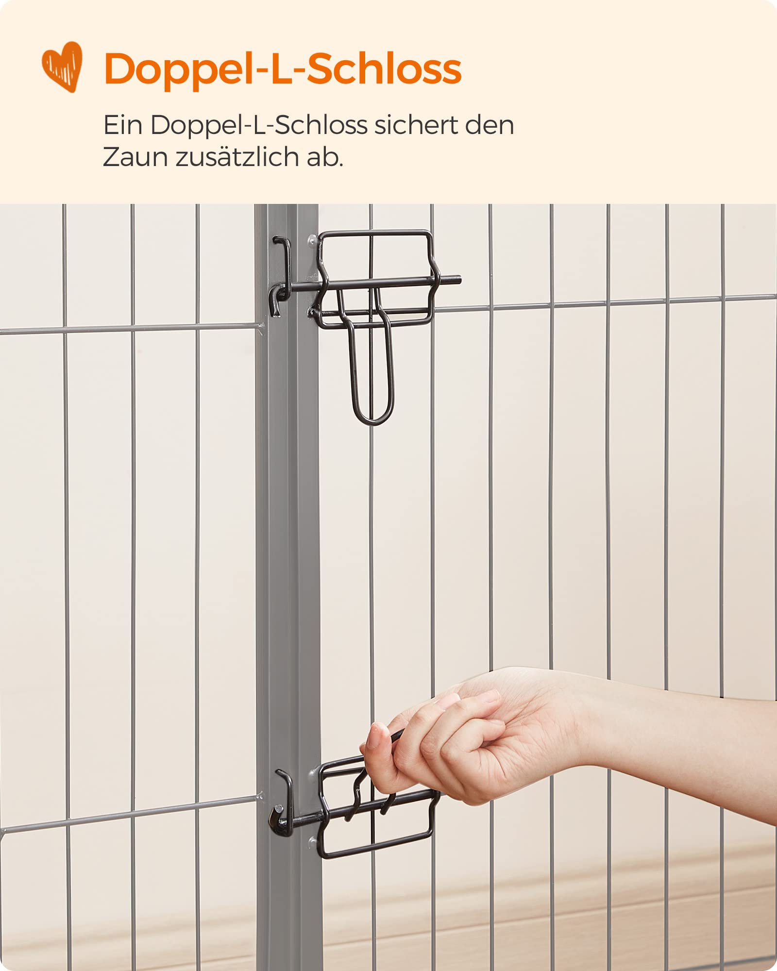 - Kannettava leikkikehä on varustettu kahdella L-muotoisella salvalla, jotka tarjoavat kaksinkertaisen suojan ja joita lemmikkieläinten on vaikea avata.