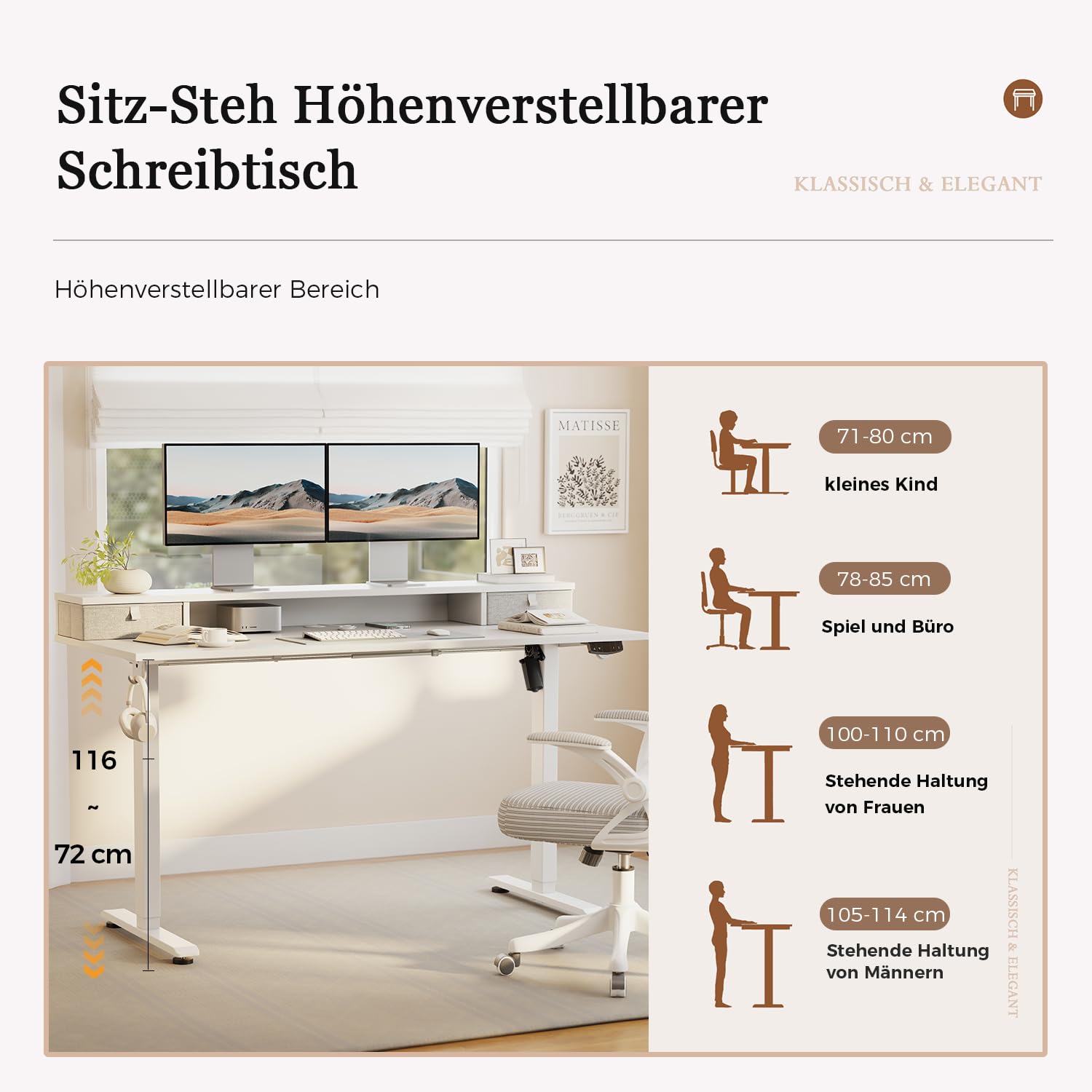 - Sähköinen nostojärjestelmä: pöydässä on edistynyt moottori, joka tukee korkeussäätöä 72 cm:n ja 116 cm:n välillä ja jonka melutaso on alhainen (alle 55 dB) käytön aikana.