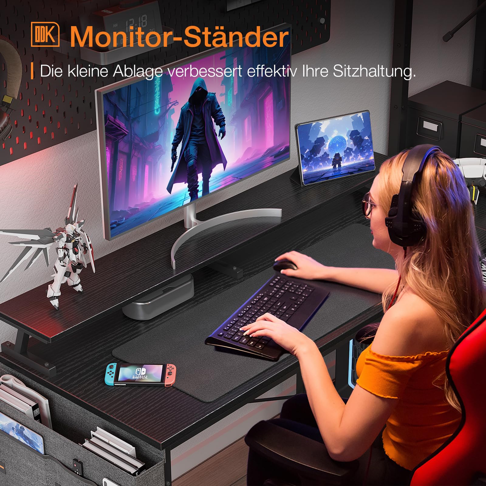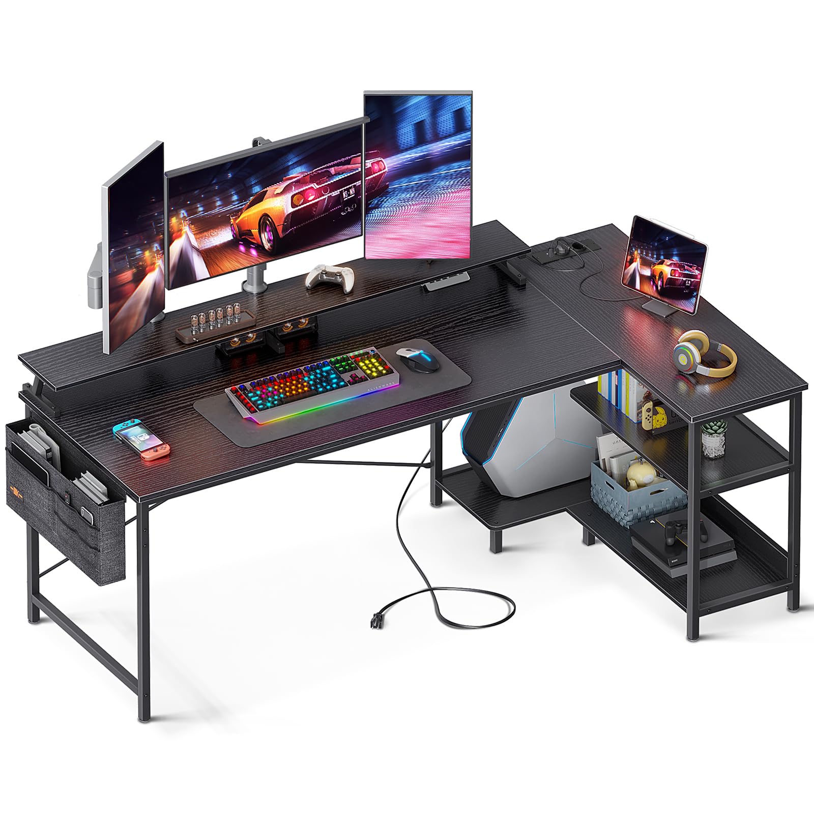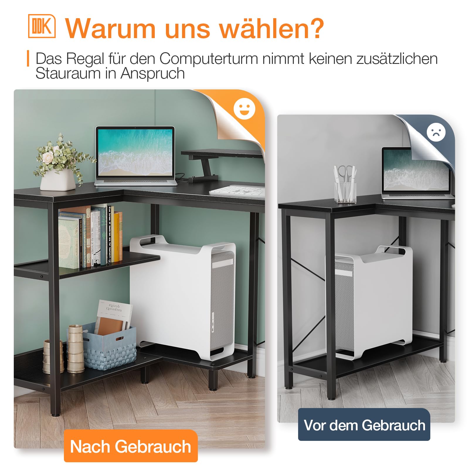 - USB-latausportit ja -pistorasiat. L-muotoinen tietokonepöytä on varustettu 2 pistorasialla ja 2 USB-latausportilla elektronisia laitteitasi varten. Voit ladata älypuhelimesi, pelilaitteitasi tai Bluetooth-laitteita kätevästi työskennellessäsi tai pelatessasi pelejä.