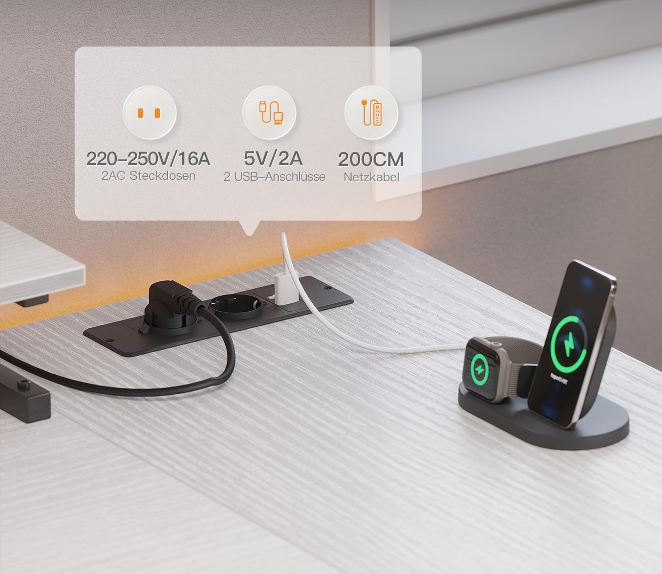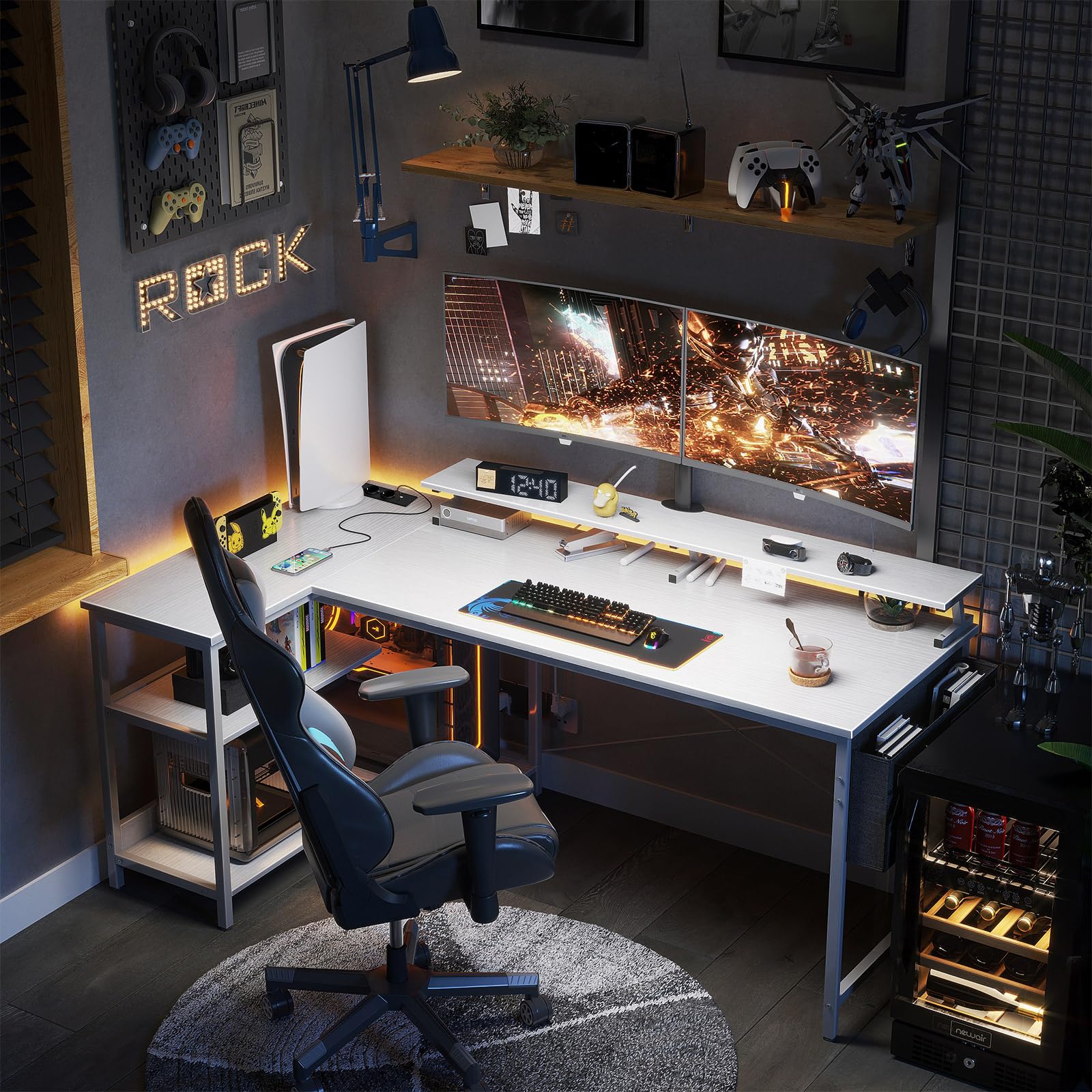 - USB-latausportit ja -pistorasiat. L-muotoinen tietokonepöytä on varustettu 2 pistorasialla ja 2 USB-latausportilla elektronisia laitteitasi varten. Voit ladata älypuhelimesi, pelilaitteitasi tai Bluetooth-laitteita kätevästi työskennellessäsi tai pelatessasi pelejä.