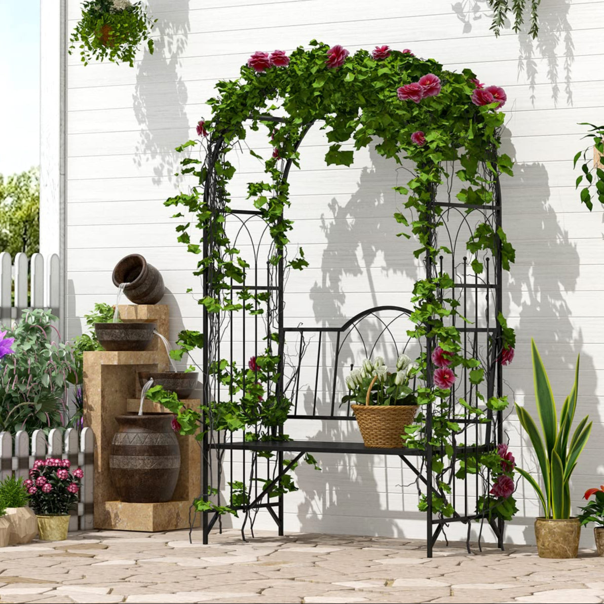 - Ruusukaari, jossa on penkki, lisää romanttista tunnelmaa puutarhaasi tai terassillesi.