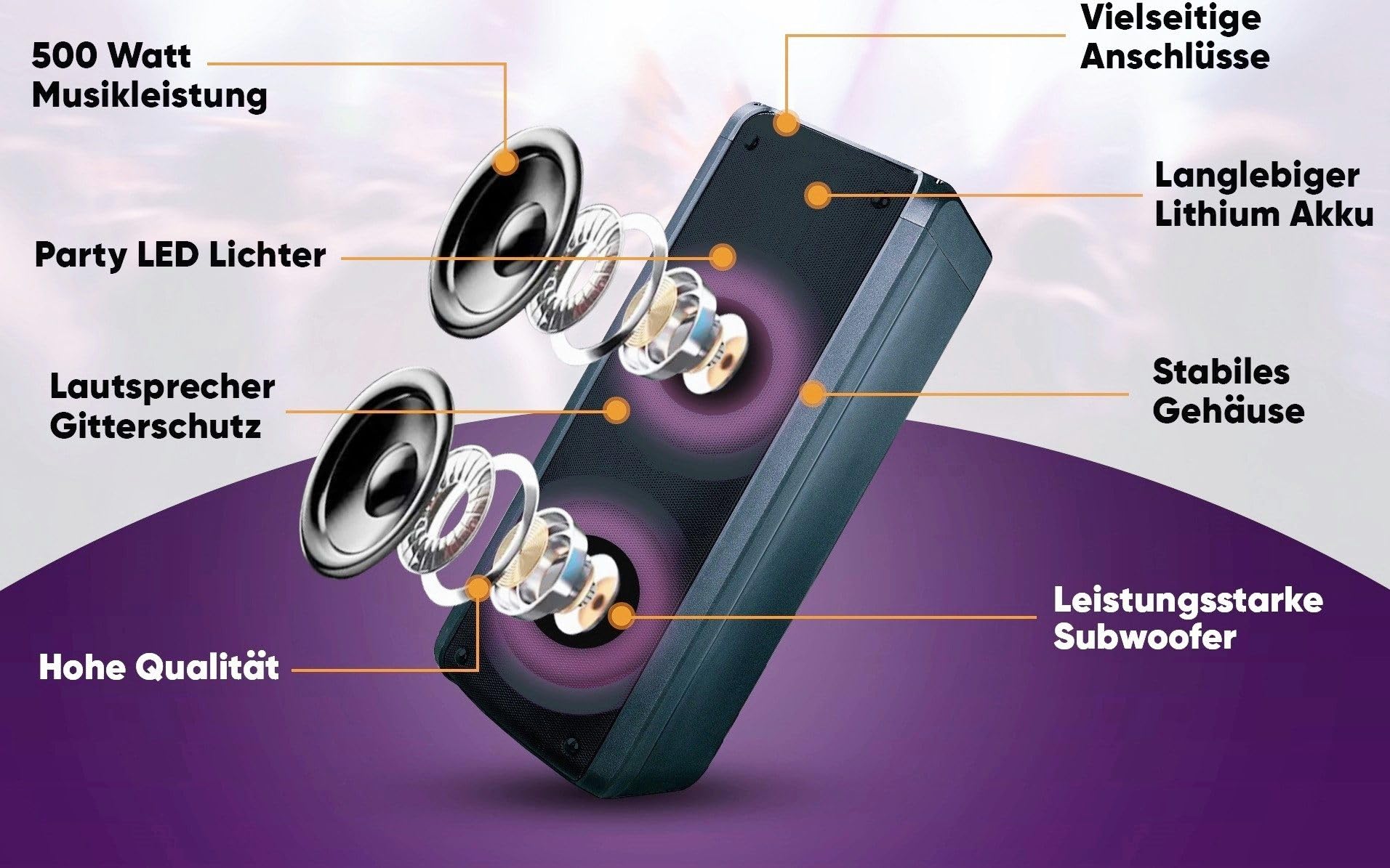 - Korkealaatuinen muotoilu mattamustan värin ansiosta, kaiuttimien edessä oleva ristikkosuoja, pyöreät LED-renkaat reunustavat kaiuttimia