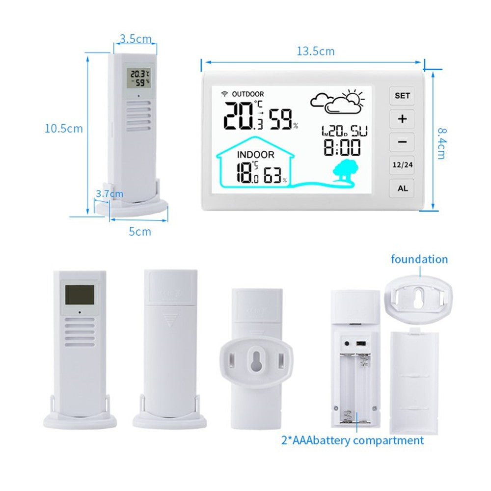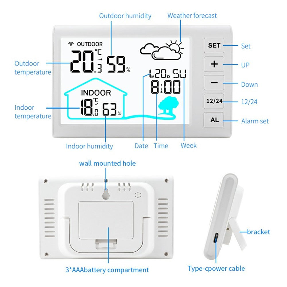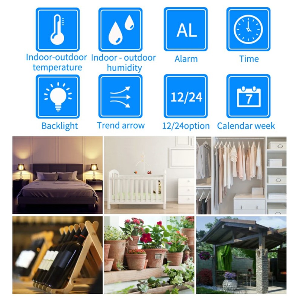 Sääaseman kello sisältää monipuolisia aikatoimintoja, kuten 12/24 tunnin aikanäytön, torkkutoiminnolla varustetun hälytyksen ja kattavan kalenterinäytön, joka näyttää kuukauden, päivämäärän ja viikonpäivän.Laitteessa on taustavalo, joka helpottaa lukemista hämärässä.