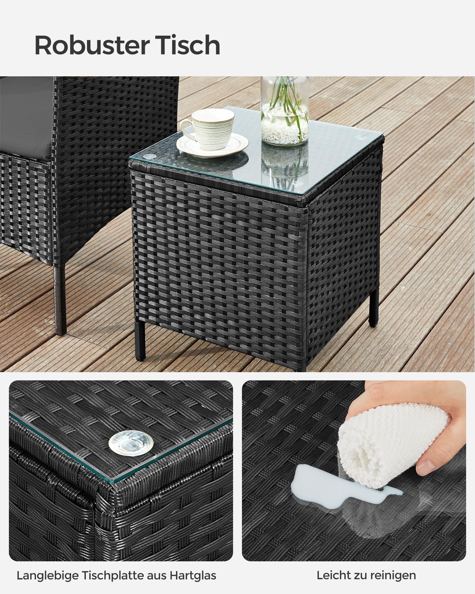 - Irrotettavat tyynynpäälliset ja lasinen pöytälevy on helppo puhdistaa