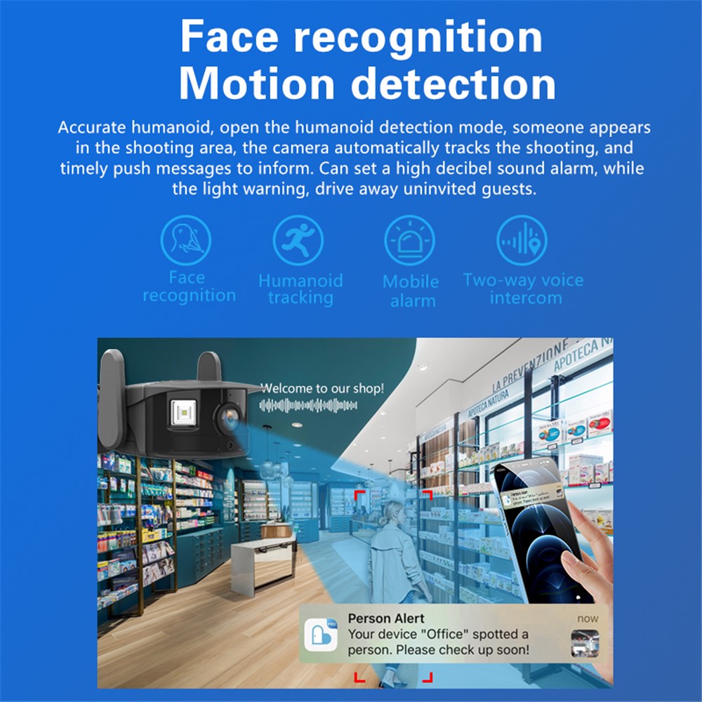 - Kaksoisnäyttöyhteys: ylemmässä näytössä on 180 asteen laajakulma ja alempi näyttö tukee automaattista vakionopeudensäädintä, elektronista panorointia ja kallistusta, humanoiditunnistusta ja kasvojentunnistusta.