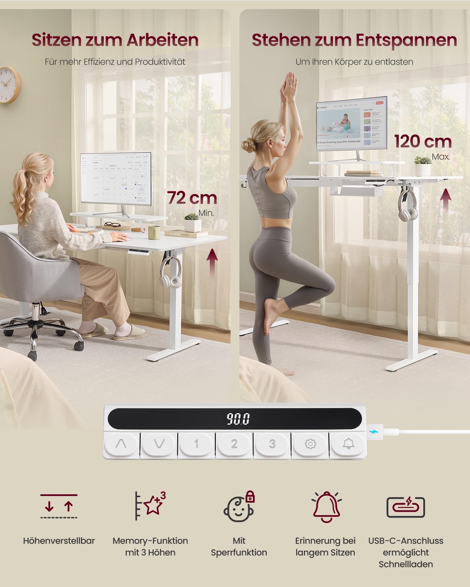 - 72–120 cm korkeussäädettävä pöytälevy mahdollistaa vaihtamisen istuma- ja seisoma-asennon välillä; 3 muistikorkeutta nopeaan säätöön; muistutus pitkästä istumisesta kehon kuormituksen helpottamiseksi.